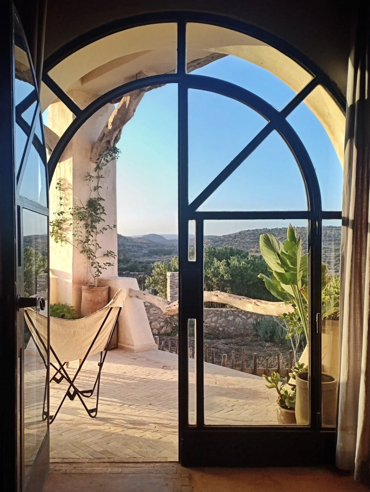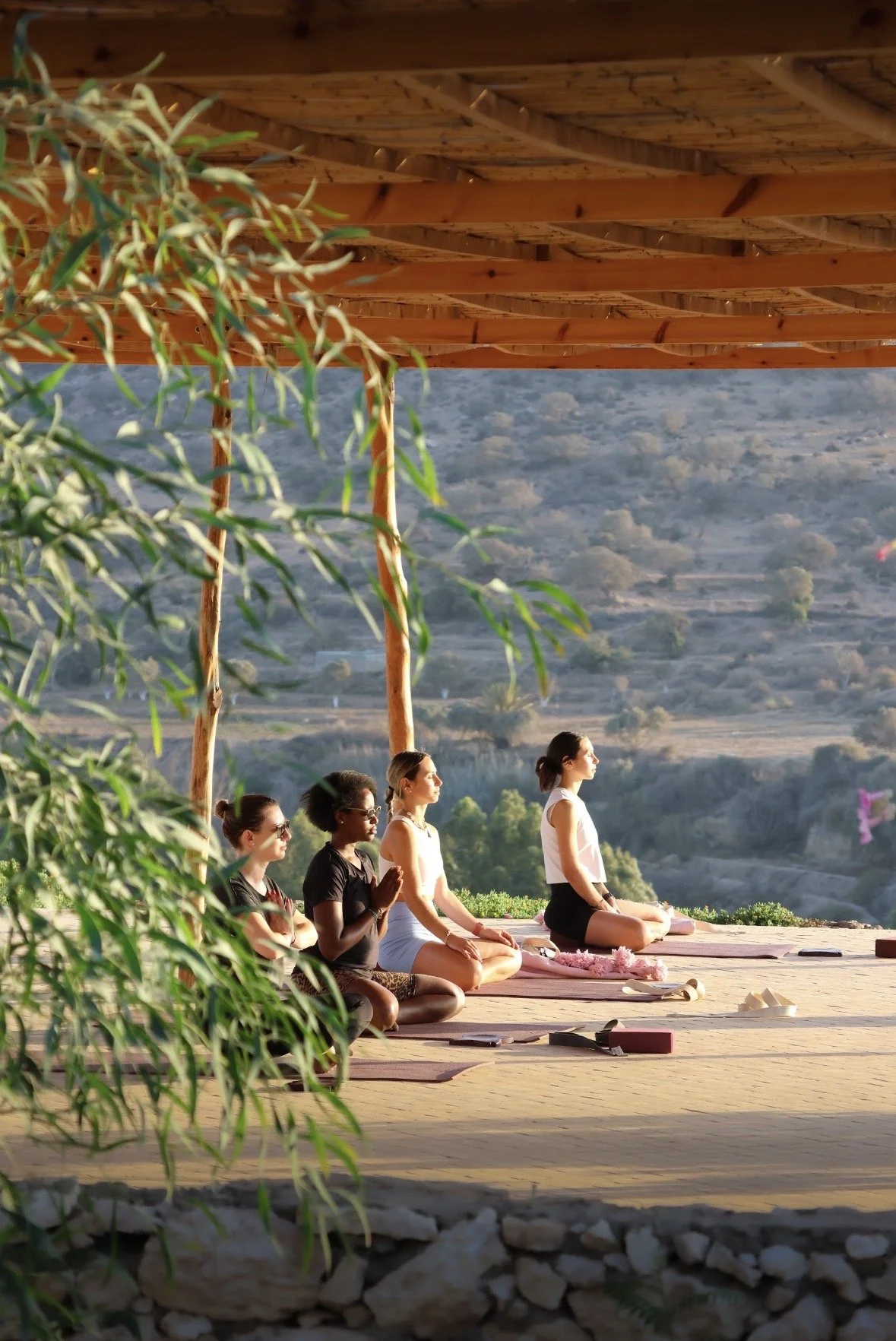 Meditation practice surrounded by nature with a view of the Atlas Mountains.